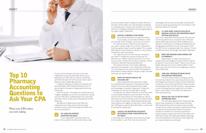 I came up with the idea for this article on questions independent pharmacy owners should ask their CPAs for the March 2017 issue in an unexpected place: my sister’s Journal of Accountancy. I was flipping through the magazine and saw an article on questions CPAs wish their clients would ask. It occurred to me to flip that idea around and do an article on questions independent pharmacy owners should ask their CPAs.