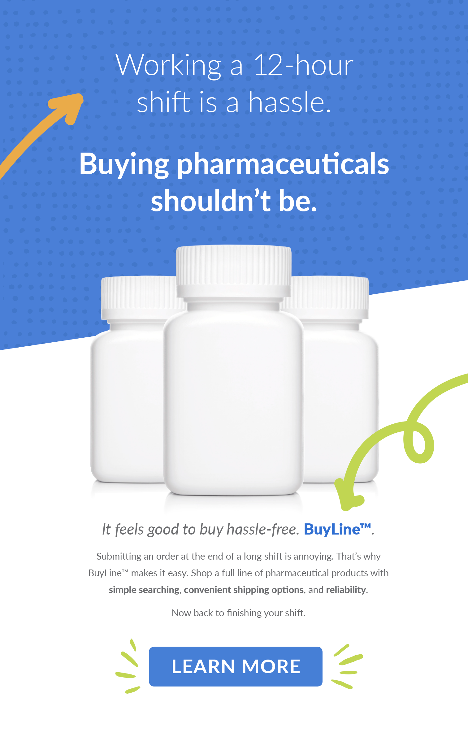 Armed with that direction, I came up with the idea to write copy that got to the heart of the problems pharmacy owners face on a day-to-day basis. And to juxtapose those problems with the ease of this new ordering service. My plan was to show that ordering pharmaceuticals, which pharmacy owners have to do every day, can be simple and convenient.