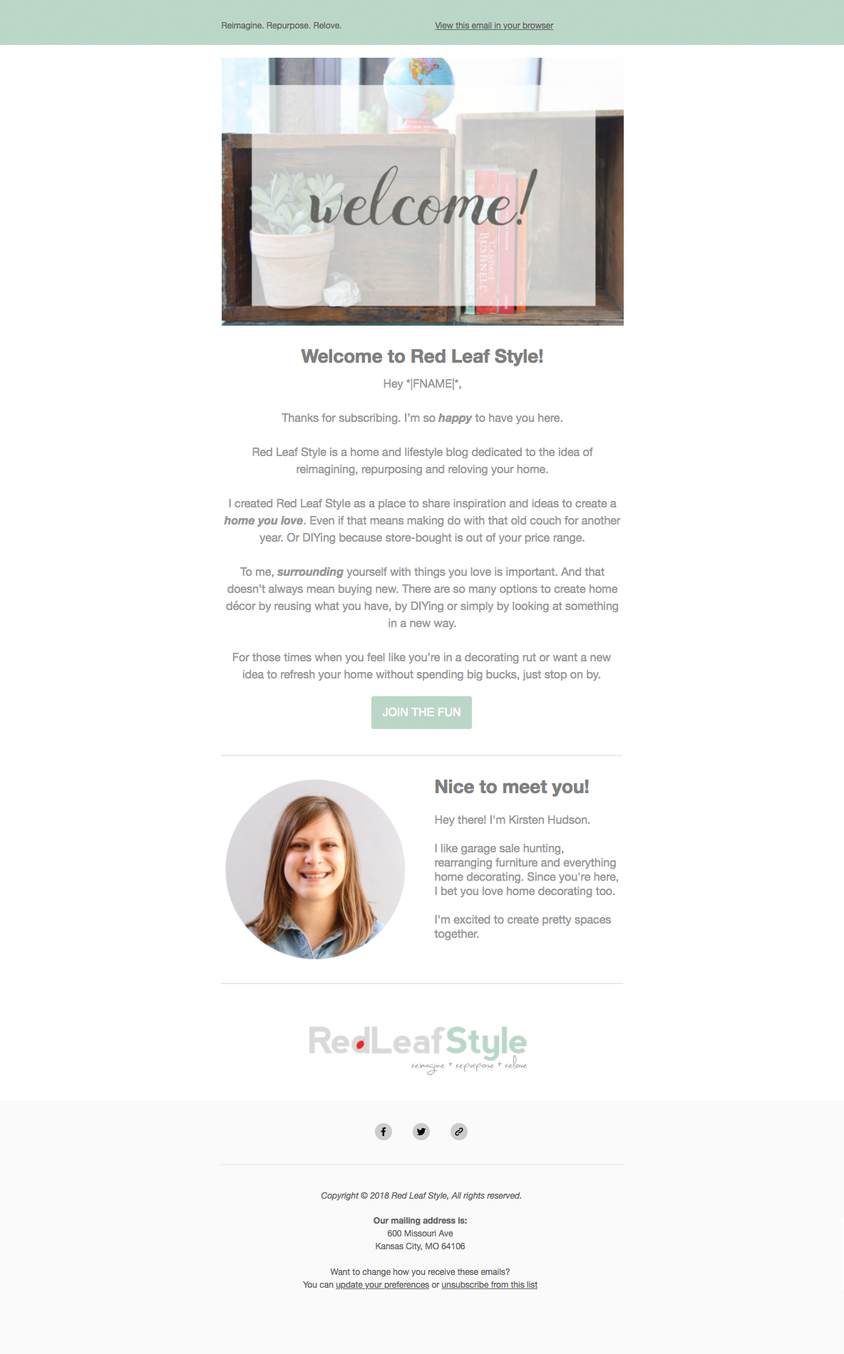 This is an example of an ongoing welcome campaign I created for my personal home decorating blog, Red Leaf Style. This welcome message automatically triggers to send when someone joins my email list.
